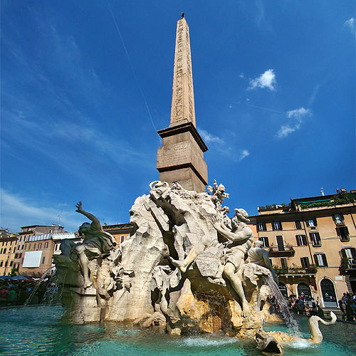 выполнил вечный противник и конкурсент Бернини - Франческо Борромини, ему же принадлежит идея установки в центре фонтана обелиска и аллегорических фигур четырёх рек. В 1629 году был назначен главным архитектором собора Святого Петра.